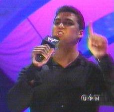 He has a mic again ^oo^... He has a smile or a smirk on his face.. He has a plan or something...
